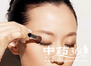 步骤一:眉毛之间塑造出高光的立体感觉。眼睛之所以看起来感觉偏小,原因是在于眼睛周围显得太过平坦。因此在眉骨下方最突出的位置轻轻的点上白色的眼影,就可以让眼窝看起来更深邃哦。