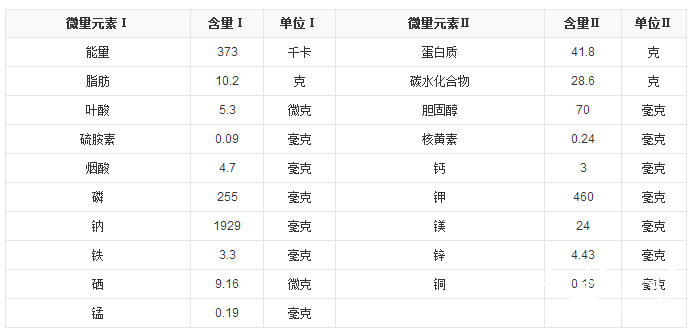 每100克猪肉松含有能量373千卡,蛋白质41.8克,脂肪10.2克,碳水化合物28.6克,叶酸5.3微克,胆固醇70毫克,硫胺素0.09毫克,核黄素0.24毫克,烟酸4.7毫克,维生素E2毫克,钙3毫克,磷255毫克,钾460毫克,钠1929.2毫克,镁24毫克,铁3.3毫克,锌4.43毫克,硒9.16微克,铜0.19毫克,锰0.19毫。