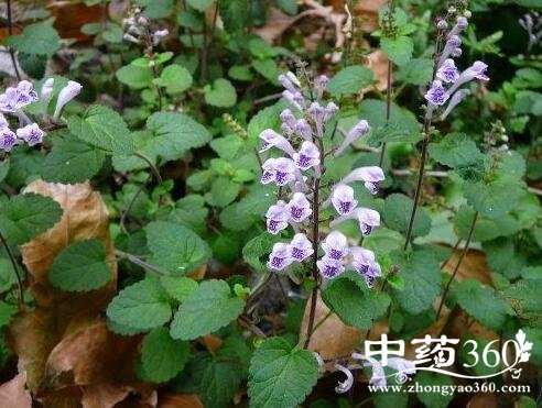 【简介】韩信草,中药名,为唇形科植物韩信草的全草。全草长10-25cm,全体被毛,叶上尤多。根纤细。茎方柱形,有分枝,表面灰绿色。叶对生,叶片灰绿色或绿褐色,多皱缩,展平后呈卵圆形长1.5-3cm,宽1-2.5cm,先端圆钝,基部浅心形或平截,边缘有钝齿;叶柄长0.5-2.5cm。总状花序顶生,花偏向一侧,花冠蓝色,二唇形,多已脱落。长约1.5cm。宿萼钟形,萼筒背部有一囊状盾鳞,呈“耳挖”状。小坚果圆形,淡棕色,气微,味微苦。以茎枝细匀、叶多、色绿褐、带“耳挖”状果枝者为佳。