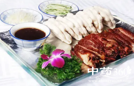 (3)将炸好的肘子放在盆中,加盐,酱油,糖,大料,桂皮,适量的汤上锅蒸软烂取出,肉皮向上装盘。蒸肉原汤倒入炒锅中,烧开,水淀粉勾芡,将汁浇在肘子上即可。