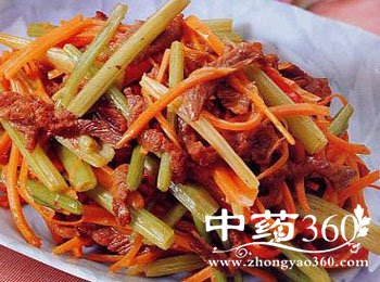 牛肉(肥瘦):牛肉富含丰富蛋白质,氨基酸组成比猪肉更接近人体需要,能提高机体抗病能力,对生长发育及术后,病后调养的人在补充失血、修复组织等方面特别适宜,寒冬食牛肉可暖胃,是该季节的补益佳品;牛肉有补中益气,滋养脾胃,强健筋骨,化痰息风,止渴止涎之功效,适宜于中气下隐、气短体虚、筋骨酸软、贫血久病及面黄目眩之人食用。芹菜:芹菜是常用蔬菜之一,既可热炒,又能凉拌,深受人们喜爱。近年来诸多研究表明,这是一种具有很好药用价值的植物。丰富的铁、锌等微量元素,有平肝降压,安神镇静,抗癌防癌,利尿消肿,增进食欲的作用。近年来的研究还表明,多吃芹菜还可以增强人体的抗病能力。国外科学家发现,由于芹菜中富含水分和纤维素,并含有一种能使脂肪加速分解、消失的化学物质,因此是减肥的最佳食品。胡萝卜:胡萝卜能提供丰富的维A,可促进机体正常生长繁殖、维持上皮组织、防止呼吸道感染与保持视力正常、治疗夜盲症和眼干燥症等功能。同时还能增强人体免疫力和抗癌的作用,并可减轻癌症病人的化疗反应,对多种脏器有保护作用。妇女进食胡萝卜可以降低卵巢癌的发病率。另外胡萝卜内所含的琥珀酸钾,有助于防止血管硬化,降低胆固醇,对防治高血压有一定效果。胡萝卜素可清除致人衰老的自由基,所含的B族维生素和维C等也有润皮肤、抗衰老的作用。另外它的芳香气味是挥发油造成的,能增进消化,并有杀菌作用。