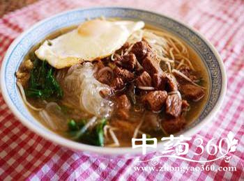 牛肉(肥瘦):牛肉富含丰富蛋白质,氨基酸组成比猪肉更接近人体需要,能提高机体抗病能力,对生长发育及术后,病后调养的人在补充失血、修复组织等方面特别适宜,寒冬食牛肉可暖胃,是该季节的补益佳品;牛肉有补中益气,滋养脾胃,强健筋骨,化痰息风,止渴止涎之功效,适宜于中气下隐、气短体虚、筋骨酸软、贫血久病及面黄目眩之人食用。粉丝:粉条里富含碳水化合物、膳食纤维、蛋白质、烟酸和钙、镁、铁、钾、磷、钠等矿物质。粉条有良好的附味性,它能吸收各种鲜美汤料的味道,再加上粉条本身的柔润嫩滑,更加爽口宜人;但是粉条含铝很多一次不宜食用过多。