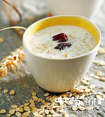 3、在粥中冲入鲜牛奶,用中火煮沸;加入麦片及白糖,搅拌均匀,出锅装碗即可。