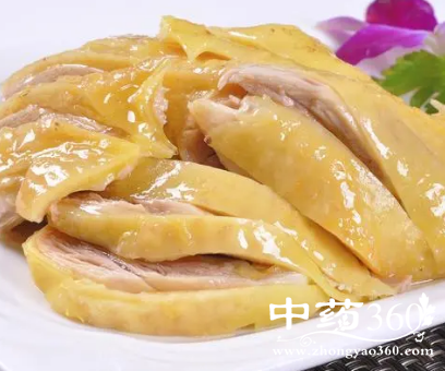 4、晾干表皮,浇上熟花生油,斩成小块,盛入碟中,摆成鸡形。吃时佐以姜茸、葱丝