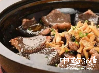 蛇肉:蛇肉含人体必需的多种氨基酸,其中有增强脑细胞活力的谷氨酸,还有能够解除人体疲劳的 天门冬氨酸等营养成分,是脑力劳动者的良好食物。蛇肉具有强壮神经、延年益寿之功效。其蛋白质中含人体必需的八种氨基酸,而胆固醇含量很低,对防治血管硬化有一定的作用,同时有滋肤养颜、调节 人体新陈代谢的功能。蛇肉中所含有的钙、镁等元素,是以蛋白质融合形式存在的,因而更便于人体吸收利用所以对预防 心血管疾病和 骨质疏松症、炎症或结核是十分必要的。蛇肉可以 补气血,强筋骨、通经络、祛风除疾; 美容养颜,滋养肌肤。在临床上多适宜于风湿痹症, 肢体麻木, 过敏性皮肤病, 脊柱炎、 骨结核、关节结核、 淋巴结核及末稍神经麻痹者食用。