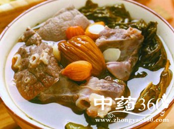 猪肺:猪肺有补虚、止咳、止血之功效,可用于治疗肺虚咳嗽、久咳咯血等症;常人不必多食。甜杏仁:杏仁含有丰富蛋白质、维生素及钙、镁、锌、硒等营养元素,还含有丰富的黄酮类和多酚类成分,这种成分不但能够降低人体内胆固醇的含量,还能显著降低心脏病和很多慢性病的发病危险。杏仁还有美容功效,能促进皮肤微循环,使皮肤红润光泽。