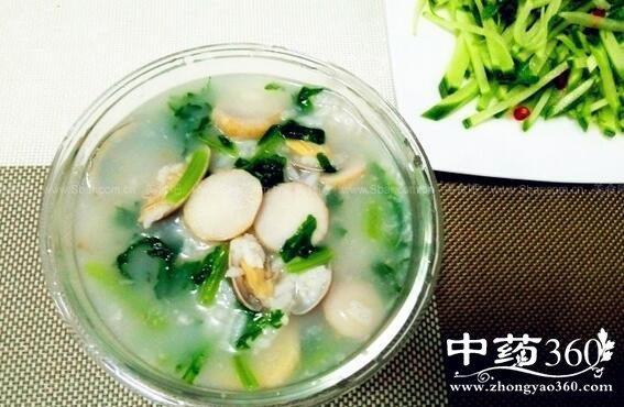 材料准备:芋头4、5个、茼蒿6、7根、大米8-10小汤勺 、盐适量、精肉、海米或花蛤(文蛤)少许