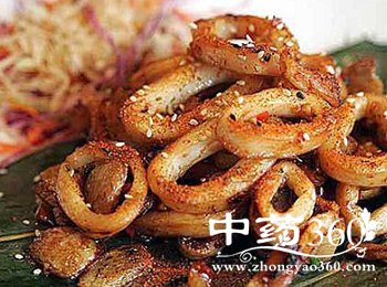 鱿鱼(鲜):鱿鱼富含钙、磷、铁元素,利于骨骼发育和造血,能有效治疗贫血;除富含蛋白质和人体所需的氨基酸外,鱿鱼还含有大量的牛黄酸,可抑制血液中的胆固醇含量,缓解疲劳,恢复视力,改善肝脏功能;所含多肽和硒有抗病毒、抗射线作用。中医认为,鱿鱼有滋阴养胃、补虚润肤的功能。鱿鱼之类的水产品性质寒凉,脾胃虚寒的人应少吃;鱿鱼含胆固醇较多,故高血脂、高胆固醇血症、动脉硬化等心血管病及肝病患者应慎食;鱿鱼是发物,患有湿疹、荨麻疹等疾病的人忌食。