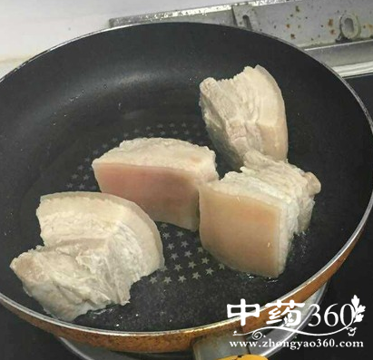 3.锅里放少许植物油,一定要少因为煎肉就是让肉里面的油流出一部分,个人建议最好用煎锅,方便快捷,煎肉是很煎熬的过程也很关键的一步,面临着被油崩到的危险所以大家要注意安全,不沾锅崩油很严重建议不用不沾锅。煎出来的油随时倒入小碗,以后可以用来炒菜非常香!