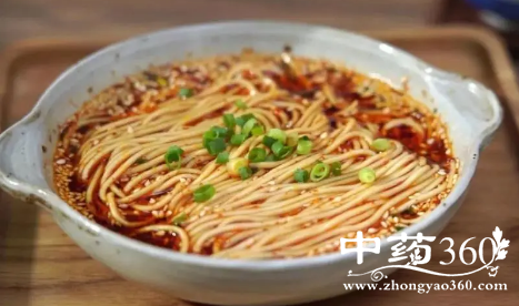 4、 将面条煮熟,捞入铺着白菜的空碗中,淋上油辣椒,浇入热汤,用汤和面将白菜烫熟,这样保持了白菜的绿色和脆爽;