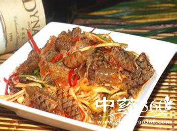鱼皮:鱼皮含有丰富的蛋白质和多种微量元素,其蛋白质主要是大分子的胶原蛋白及粘多糖的成分,是女士养颜护肤美容保健佳品,近年医学研究发现,“鱼皮”中的白细胞素?亮氨酸有抗癌作用。中医理论认为,鱼皮味甘咸性平,具滋补功效,对胃病、肺病有治疗效果。辣椒(青、尖):辣椒是老百姓餐桌上最常见的一种原料,其营养丰富,口味独特,就餐时能增加饭量,多食可增强体力,改善怕冷、冻伤、血管性头痛等症状。同时辣椒中含有一种物殊物质,能加速新陈代谢,促进荷尔蒙分泌,保健皮肤。富含的维C,可以控制心脏病及冠状动脉硬化,降低胆固醇。含有较多抗氧化物质,可预防癌症及其他慢性疾病。可以使呼吸道畅通,用以治疗咳嗽、感冒。辣椒还能杀抑胃腹内的寄生虫。