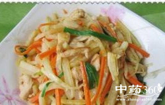 芥兰头去皮切丝 胡萝卜切丝 鸡脯肉切丝(也可用瘦肉、五花肉),用盐、生抽、生油、一点点生粉拌匀腌制一下;配料:葱切成段