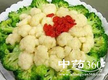 菜花:菜花中丰富的维C、胡萝卜素、硒、维K、等多种具有生物活性的物质。对人体可增强肝脏解毒能力、提高机体的免疫和抗病能力、防止感冒和坏血病的发生、还可防治胃癌、乳腺癌,抑制癌肿生长,减少癌症的发病几率。同时大量的类黄酮、吲哚衍生物和二硫酚硫酮,还可减少心脏病与中风的危险,降低人体内雌激素水平,阻止皮肤色素斑的形成,对肌肤有很好的美白效果。菜花性凉、味甘,可补肾填精,健脑壮骨,补脾和胃。特别适合生长发育期儿童和在污染环境中生活的人食用。松花蛋(鸭蛋):松花蛋较鸭蛋含更多矿物质,脂肪和总热量却稍有下降。它能刺激消化器官,增进食欲,促进营养的消化吸收,中和胃酸,清凉,降压。具有润肺、养阴止血、凉肠、止泻、降压之功效。此外,松花蛋还有保护血管、提高智商、保护大脑的功能。鸡蛋:鸡蛋含有丰富的蛋白质、脂肪、维生素和铁、钙、钾等人体所需要的矿物质,其蛋白质是自然界最优良的蛋白质,对肝脏组织损伤有修复作用;同时富含DHA和卵磷脂、卵黄素,对神经系统和身体发育有利,能健脑益智,改善记忆力,并促进肝细胞再生;鸡蛋中含有较多的维生素B和其他微量元素,可以分解和氧化人体内的致癌物质,具有防癌作用;鸡蛋味甘,性平;具有养心安神,补血,滋阴润燥之功效。