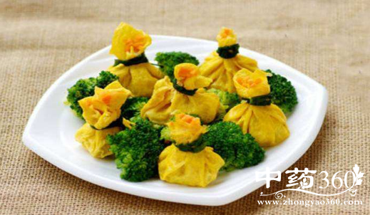 8. 一份蛋皮切4片,取一片包入适量馅料,用烫软的葱叶扎口,排放碟上,隔水蒸10分钟左右,淀粉加水和剩余芝麻油加热调成芡汁,淋在石榴鸡上即可。