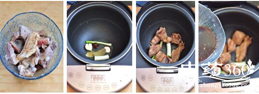 香菇排骨饭4.将腌排骨的汤汁加少许水,倒入电饭煲内。