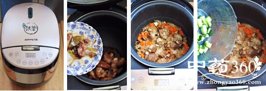 香菇排骨饭8.米饭焖好后,加入黄瓜丁和盐。