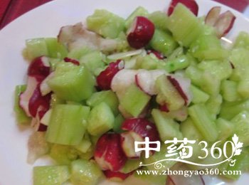 黄瓜:黄瓜是老百姓最常食用的一种食蔬,它脆嫩清香,味道鲜美,而且营养丰富。含有多种维生素,使护肤美容的佳品,可以有效地对抗皮肤老化,减少皱纹的产生,并可防治唇炎、口角炎;因其中还含有铬等微量元素,有降血糖的作用。黄瓜尾部的苦味素还有抗癌的作用,并有清热、解渴、利水、消肿之功效。水萝卜:萝卜所含热量较少,纤维素较多,吃后易产生饱胀感,这些都有助于减肥。萝卜能诱导人体自身产生干扰素,增加机体免疫力,并能抑制癌细胞的生长,对防癌、抗癌有重要作用。萝卜中的芥子油和精纤维可促进胃肠蠕动,有助于体内废物的排出。常吃萝卜可降低血脂、软化血管、稳定血压,预防冠心病、动脉硬化、胆石症等疾病。