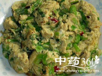 虾酱:虾酱中含有丰富的蛋白质、钙、铁、硒、维生素A等营养元素,适量食用对身体颇为有益。韭菜:韭菜为辛温补阳之品,含有一定量的锌元素,能温补肝肾,因此在药典上有“起阳草”之称,可与现今的“伟哥”媲美。此外,韭菜含有挥发性精油及含硫化合物,具有促进食欲和降低血脂的作用,对高血压、冠心病、高血脂等有一定疗效。含硫化合物还具有一定杀菌消炎的作用。韭菜含有较多的膳食纤维,能促进胃肠蠕动,可有效预防习惯性便秘和肠癌。这些膳食纤维还可以把消化道中的头发、沙砾、金属屑甚至是针包裹起来,随大便排出体外,有“洗肠草”之称。同时韭菜还有温中行气、散血解毒、保暖、健胃的功效。鸡蛋:鸡蛋含有丰富的蛋白质、脂肪、维生素和铁、钙、钾等人体所需要的矿物质,其蛋白质是自然界最优良的蛋白质,对肝脏组织损伤有修复作用;同时富含DHA和卵磷脂、卵黄素,对神经系统和身体发育有利,能健脑益智,改善记忆力,并促进肝细胞再生;鸡蛋中含有较多的维生素B和其他微量元素,可以分解和氧化人体内的致癌物质,具有防癌作用;鸡蛋味甘,性平;具有养心安神,补血,滋阴润燥之功效。