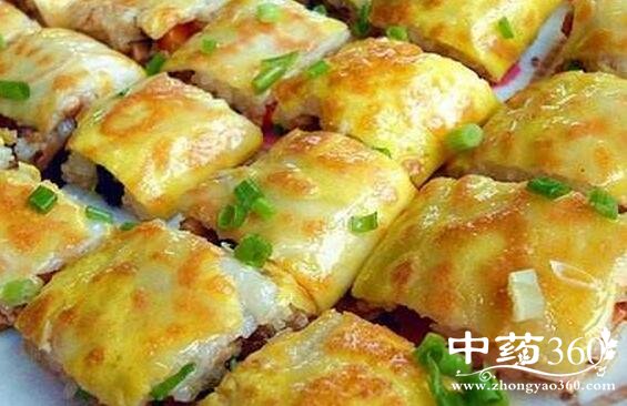 4、将豆面浆在煎锅中摊成皮,打入鸡蛋涂匀,盖锅盖。烙成熟皮。用铲子将皮四周疏松,翻面后撒盐10克,把糯米倒入铺平,在半边撒馅料铺匀,对折糯米和浆皮。