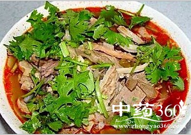 (3)羊头、心、肚、肠等均烫洗干净煮熟,切成丝下入原汤中,加葱、姜、蒜末、辣椒油、味精、香菜即成。