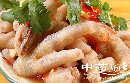 采用鸡爪、香菜、大蒜、生姜、料酒、白糖、盐、麻辣鲜、香油、柠檬、枸杞等为主要原材料。