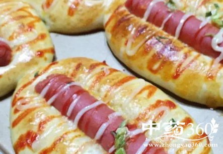 食材:110克高粉、2克酵母粉、40克低粉、15克糖、1/4小匙盐、70克水、1个蛋黄、15克黄油、2根火腿肠