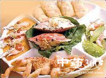 螃蟹:螃蟹不可与红薯、南瓜、蜂蜜、橙子、梨、石榴、西红柿、香瓜、花生、蜗牛、芹菜、柿子、兔肉、荆芥同食;吃螃蟹不可饮用冷饮会导致腹泻。鸡肉:鸡肉忌与野鸡、甲鱼、芥末、鲤鱼、鲫鱼、兔肉、李子、虾子、芝麻、菊花以及葱蒜等一同食用;与芝麻、菊花同食易中毒;与李子、兔肉同食,会导致腹泻;与芥末同食会上火。虾仁:1.食虾严禁同时服用大量维生素C,否则,可生成三价砷,能致死;2.不宜与猪肉同食,损精;3.忌与狗肉、鸡肉、獐肉、鹿肉、南瓜同食;4.忌糖;果汁与虾相克,同食会腹泻。海参(水浸):海参与醋相克;不宜与甘草同服。鸡蛋清:鸡蛋清不能与白糖、豆浆、兔肉同食。