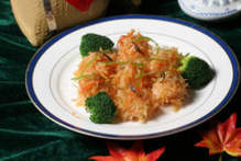 白萝卜:白萝卜是老百姓餐桌上最常见的一道美食,含有丰富的维A、维C、淀粉酶、氧化酶、锰等元素。另外,所含的糖化酶素,可以分解其他食物中的致癌物亚硝胺,从而起到抗癌作用。对于胸闷气喘,食欲减退、咳嗽痰多等都有食疗作用。海蜇皮:海蛰含有人体需要的多种营养成分,尤其含有人们饮食中所缺的碘,是一种重要的营养食品。海蜇具有清热,化痰,消积,通便之功效,用于阴虚肺燥、高血压、痰热咳嗽、哮喘、瘰疬痰核、食积痞胀、大便燥结等症。