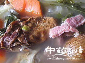 蚝豉:蚝豉中所含的蛋白质中有多种优良的氨基酸,这些氨基酸有解毒作用,可以除去体内的有毒物质,其中的氨基乙磺酸又有降低血胆固醇浓度的作用,因此可预防动脉硬化;蚝豉还含有维生素B12,具有活跃造血功能的作用;蚝豉中所含丰富的牛黄酸有明显的保肝利胆作用;蚝豉又是补钙的良好食品。蚝豉肉味咸、涩,性微寒;归肝、心、肾经;具有滋阴,养血,补五脏,活血.充肌之功效。猪腿肉:猪肉含有丰富的优质蛋白质和必需的脂肪酸,并提供血红素(有机铁)和促进铁吸收的半胱氨酸,能改善缺铁性贫血;具有补肾养血,滋阴润燥的功效;瘦肉多的腿肉其胆固醇、脂肪含量相对较少,担心肥胖或动脉硬化的中老年人适宜食用。银耳(干):银耳能提高肝脏解毒能力,起保肝作用;银耳对老年慢性支气管炎、肺原性心脏病有一定疗效;银耳富含维生素D,能防止钙的流失,对生长发育十分有益;因富含硒等微量元素,它可以增强机体抗肿瘤的免疫力;银耳富有天然植物性胶质,加上它的滋阴作用,长期服用可以润肤,并有祛除脸部黄褐斑、雀斑的功效;银耳中的有效成分酸性多糖类物质,能增强人体的免疫力,调动淋巴细胞,加强白细胞的吞噬能力,兴奋骨髓造血功能。杏仁:杏仁含有丰富蛋白质、维生素及钙、镁、锌、硒等营养元素,还含有丰富的黄酮类和多酚类成分,这种成分不但能够降低人体内胆固醇的含量,还能显著降低心脏病和很多慢性病的发病危险。杏仁还有美容功效,能促进皮肤微循环,使皮肤红润光泽。