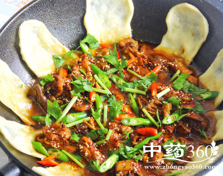 泡水的面团轻轻压扁扯成椭圆形贴在锅边上,盖盖继续焖煮15分钟,这样面饼一半铁锅烙熟,一半汤汁煨熟这样才最好吃,