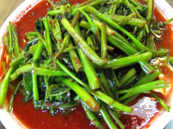 空心菜:空心菜含有丰富的纤维素、半纤维素、木质素、钙、胡萝卜素、叶绿素、蛋白质等营养元素。有促进肠胃蠕动、通便解毒、洁齿防龋、健美皮肤、防癌抗感染、防暑解热、凉血排毒、防治痢疾、降低胆固醇等功效。被称为“绿色佳品”。
