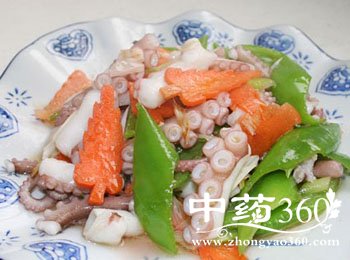 章鱼:章鱼含有丰富的蛋白质、矿物质等营养元素,并还富含抗疲劳、抗衰老,能延长人类寿命等重要保健因子?天然牛黄酸。章鱼性平、味甘咸,入肝、脾、肾经,有补血益气、治痈疽肿毒的作用。