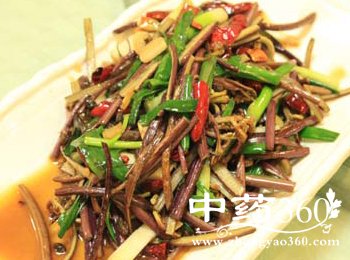 蕨菜:蕨菜素对细菌有一定的抑制作用,可用于发热不退、肠风热毒、湿疹、疮疡等病症,具有良好的清热解毒、杀菌清炎之功效。另外蕨菜的某些有效成分能扩张血管,降低血压,其中所含粗纤维能促进胃肠蠕动,具有下气通便的作用。蕨菜能清肠排毒,民间常用蕨菜治疗泄泻痢疾及小便淋漓不通,有一定效果。蕨菜可制成粉皮代粮充饥,有补脾益气,强健机体,增强抗病能力。近年来科学研究表明蕨菜还具有一定的抗癌功效。木耳(水发):黑木耳中铁的含量极为丰富,故常吃木耳能养血驻颜,令人肌肤红润,容光焕发,并可防治缺铁性贫血;黑木耳含有维生素K,能减少血液凝块,预防血栓症的发生,有防治动脉粥样硬化和冠心病的作用;木耳中的胶质可把残留在人体消化系统内的灰尘、杂质吸附集中起来排出体外,从而起到清胃涤肠的作用,它对胆结石、肾结石等内源性异物也有比较显著的化解功能;黑木耳含有抗肿瘤活性物质,能增强机体免疫力,经常食用可防癌抗癌。