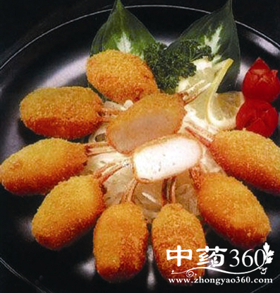 5、摆盘:用洁白圆盘,将虾头朝盘心围摆成圆形,虾身两片对称成扁圆形,每个对接虾头,再将虾尾联上,炸虾丸放在虾身围圈内。盘中心放置西红柿雕成的花朵衬托即成。