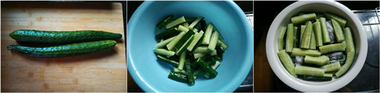 黄瓜用盐腌制10分钟,看到有绿色的水出来就可以冲洗好备用了。这是黄瓜爽口,脆的关键