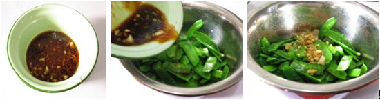 8.将搅拌均匀的料汁倒入沥干水分的荷兰豆中。