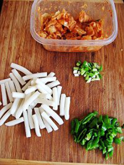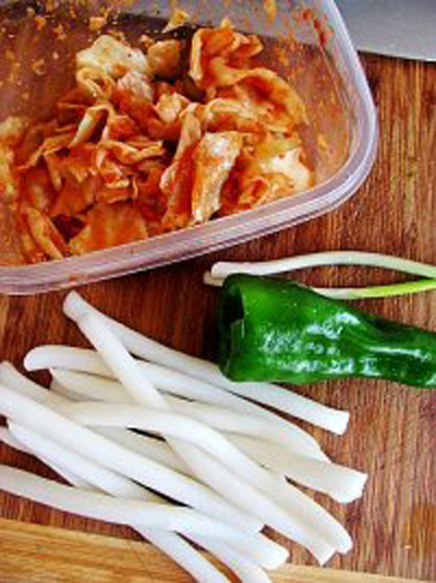 主料:韩国辣白菜150g;年糕150g;青椒1个;