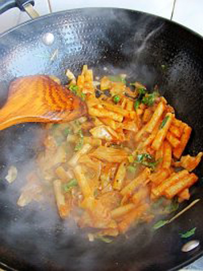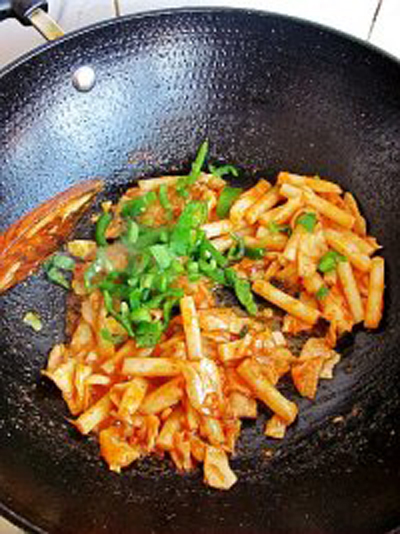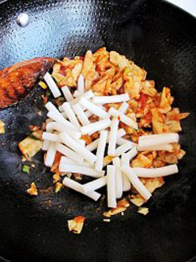 小贴士:泡菜一定要炒出香味,再放入其他食材才好吃。