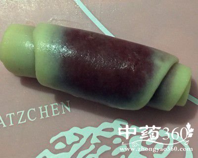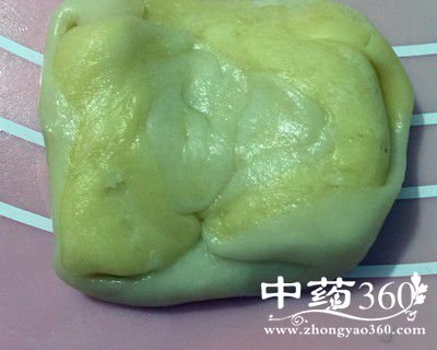 14. 再将面团按扁压平,收口朝下用擀面杖将酥皮擀成中间厚四面薄的面皮;