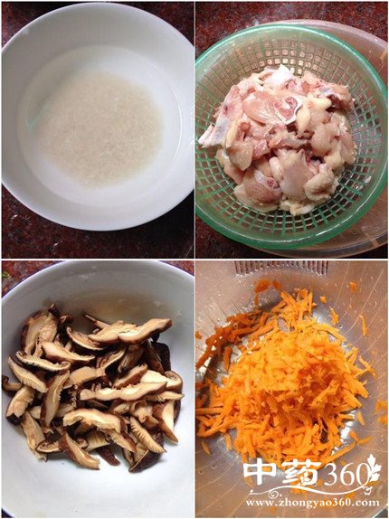 大米(60克)鸡肉(100克)香菇(2个)胡萝卜(20克)