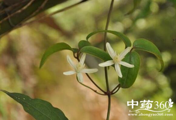 【来源】为毛茛科植物山木通的根、茎、叶。原植物山木通Clematis finetiana Levi。et Vant.:半常绿攀缘灌木,高达4—13米。茎红褐色,有条纹,无毛,偶稀生短毛。3出复叶,间有单叶,对生;叶柄旋卷;小叶披针形,宽卵形或卵状长方形,长5—12厘米,宽2—4.5厘米,基部心形或圆形,先端尖,全缘革质。单花或3花,有时5花成总状花序,腋生;苞片线形,长尖或先端具3齿,有短直毛;花梗长5—12厘米,小苞片2,线形,有毛,花柄中间有时有微小苞片;花白色,直径3~5厘米,花被4,有时较多,披针形,下面沿边有密绒毛,雄蕊多数,花丝扁,雌蕊甚密,子房及花柱均有长直毛。瘦果纺锤形而扁,长5毫米,有黄色直毛,柱头宿存,有羽状毛。分布我国长江流域及浙江、福建、广东、广西、云南、贵州等地。