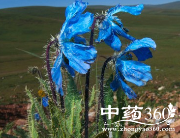 【原形态】多刺绿绒蒿 一年生草本,高约15-20cm。全株被黄褐色或淡黄色坚硬而平展的毛状刺。主根肥而长。茎近无或极短。叶基生;叶柄长0.5-3cm;叶片披针形,长5-12cm,宽约1cm,全缘或波状,两面被黄褐色或淡黄色平展的刺。花葶坚硬,通常5-12或更多;花单生于花葶上,半下垂,直径约2.5-4cm,萼片2,具淡黄色毛状刺,绿色,早落;花瓣4-8,蓝紫色,宽倒卵形,长1.2-2cm,宽约1cm;雄蕊多数,长达1cm,花丝丝状,色较花瓣深,花药长1.5-2mm;子房圆锥形,被黄褐色平展或斜展的刺,花柱明显,柱头头状。蒴果卵形、椭圆形或长圆形,长1.2-1.5cm,被锈色或黄褐色平展或反曲的刺,能常3-5瓣自先端形裂至全长的1/3-1/4。花期7-8月,果期9-10月。