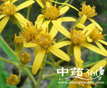 【原形态】糙地千里光 多年生草本,高50-90cm。根状茎木质块状。茎直立,单生或2-3簇生,常从基部起分枝,下部木质,无毛或稍被绵毛。基部和下部叶在花期枯萎具凋落;中部叶较密集,多数,无柄,披针形至线形,长5-10,pam 0。3-1cm,先端尖,基产楔形,无耳,边缘反卷,有一明显疏软骨质细齿或近全缘,上面具疏糙毛或近无毛,下面及边缘具短硬毛或糙毛,羽状脉,侧脉6-7对,上面不明显,下面中脉稍凸起,侧脉开展;上部叶较小,线形。头关花序,排列成顶生和腋生圆锥状聚伞花序;分枝直立或开燕尾服,梗细长,有细尖苞叶;花序梗长1-2.5cm,多少被蛛丝状毛;具苞片和1-10线状钻形小苞片;总苞钏状或陀螺状,长7-9mm,总苞片1层,约13个,披针形,宽1-1.5mm,背面被微绵毛或近无毛,边缘狭膜质,先先尖,基部有多数条形苞叶;舌状花约10余个,黄色,长圆形;筒状花多数。瘦果,圆柱形,长2.5-3mm,被柔毛;冠毛白色,长约5mm。