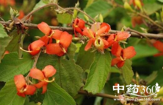 【原形态】火索麻 灌木,高达2m。小枝被星状茸毛。叶互生,叶柄长8-25mm,被柔毛;托叶条形,长7-10mm,早落;叶片卵形,长10-12cm,宽7-9cm,先端短渐尖并常具小裂片,基部圆形或斜心形,边缘具锯齿,上面被星状短柔毛,下面密被星状短柔毛;基生脉5条。聚伞花序腋生,常2-3个簇生,长达2cm;小苞片钻形,长7mm;花红色或紫红色,直径3.5-4cm;萼长17mm,通常4-5浅裂,裂片三角形且排成二唇状;花瓣5,不等大,前面2枚较大,长12-15mm,斜镰刀形;雄蕊10,退化雄蕊5,与花丝等长;于房略具乳头状突起,授粉后螺旋状扭曲。蒴果圆柱状,螺旋状扭曲,成熟时黑色,长5cm,宽7-9mm,先端税尖,并具长喙,初被星状柔毛,后逐渐脱落。种子细小,直径小于2mm。花期4-10月。