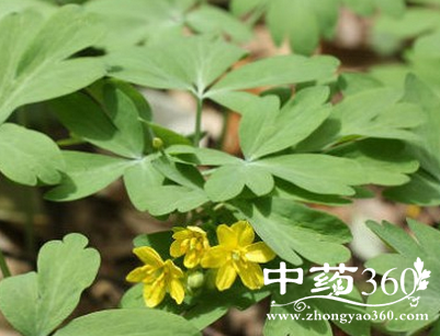 【原形态】江南牡丹草,多年生草本。根茎近球形,直径可达8cm,断面淡黄色。地上茎单一或数茎丛生,高约20-40cm,直立或外倾,无毛而多少被白粉,通常黑紫色。叶1枚,位于茎顶,三出复叶,每小叶2-3回三出羽状分裂,叶脉网状,纤细,上面淡绿色,下面粉绿色。花序总状,顶生,具10-20朵花;总苞片与叶柄愈合,2裂;苞片初时三角状宽卵形,后渐变为肾形或近肾形,顶端常突尖。花黄色,直径1.1-1.5(-1.8)cm,萼片(5-)6(-8),花瓣状,通常长椭圆形或卵形,具5纵脉,长(7-)8-9(-10)mm,宽5-6mm;花瓣(5-)6,退化成蜜腺状,长约2mm;雄蕊5-(6),长约为1/2-2/3;子房菱状卵形,基部具短柄,花柱短。蒴果近球形,果爿5,近等大,先端尖。种子通常2,近倒卵形,上部裸露,熟时绿色褐色。花期3-4月,果4-5月。