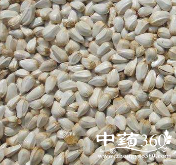 【药材】瘦果,长7~8毫米,宽6~7毫米,厚4~5毫米,呈倒卵圆形,外面白色而光滑,具4条肋,前端截形,四角鼓起,中央微凸,基脚钝而狭,侧面有一凹点。果壳坚脆,里面黑褐色而有光泽。种子淡黄白色,充满胚乳;切面白色,角质状,无甚气味,嚼之略有油样感。