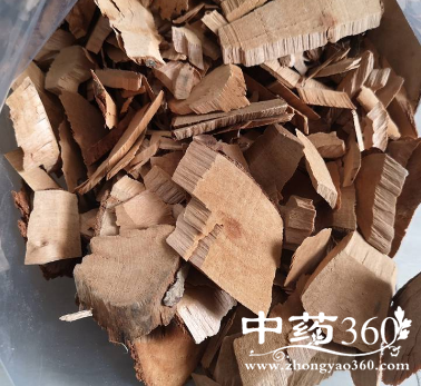 【药材】根圆柱形,常不规则弯曲,直径通常2~3厘米,表面粗糙,棕褐色,具明显的横向裂纹和因干缩所致的纵皱,少数栓皮易剥落现出棕色皮部。质坚硬,不易折断。断面淡棕色,外围红棕色,木质部占根的大部分,并可见同心环(年轮)。气香,味辛涩。根皮呈不规则的块片,大小不一,略卷曲,厚1~2毫米,外表棕褐色,具纵皱及少数横向裂纹。内表面红棕色,光滑;有纵向纹理。质坚脆,断面略整齐,气、味同根。橇及根皮均以干燥无泥杂者佳。