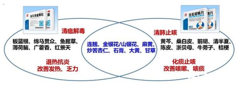 其中,连花清瘟以东汉张仲景《伤寒杂病论》麻杏石甘汤与清代吴鞠通《温病条辨》银翘散为基础方,汲取明代吴又可《温疫论》治疫病用大黄的用药经验。而连花清咳片融汇了东汉张仲景麻杏石甘汤宣肺泄热,明代叶文玲清金化痰汤清泄肺热、化痰止咳,配伍山银花、连翘、牛蒡子清热解毒,大黄通腑泄肺,具有“宣肺泄热、止咳化痰”的功效。