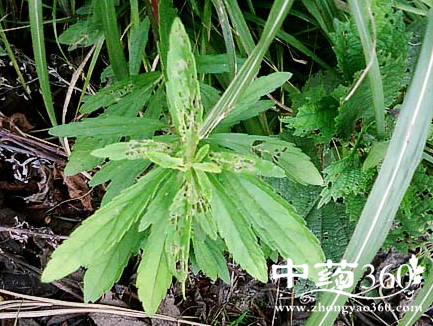 植物形态:为多年生草本。根茎横走,茎高一米左右,圆柱形。叶对生通常三裂,茎上部叶片往往单一较小,叶缘具不整齐的锯齿。表面绿色,背后淡绿色,无腺点,沿叶脉疏被柔毛。头状花序紧密排列呈聚伞形,总苞长6~8毫米,总苞片10枚左右,花冠下部呈管状,上部稍宽顶端五裂,白色,瘦果。