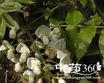 【原形态】白花藤萝 攀援状落叶灌木,高1-2米。嫩枝绿色;老枝灰黄色,树皮常不规则开裂。奇数羽状复叶;叶与花同时开放,小叶9-13,长6-10cm,宽3-4cm,小叶片卵形或长椭圆形,先端短尖,基部圆形至几心形,两面均被丝状细毛;总叶柄长15-20cm,基部膨大。总状花序,下垂,长10-15cm;花白色,萼钟状,短5齿裂,下面裂齿较大;旗瓣大,外弯,基部有附属体,翼瓣镰形,基部有耳,龙骨瓣钝;雄蕊10,二体。荚果长15-20cm,密生绒毛。种子数颗,球形。花期6-7月,果期8-9月。